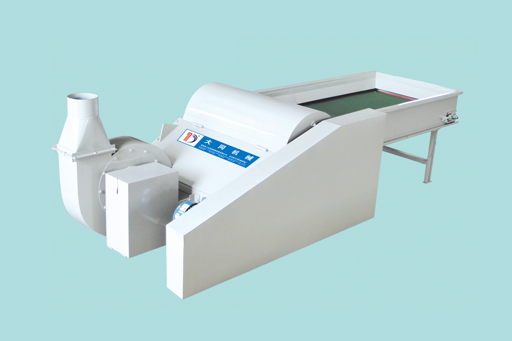 各種捆包纖維均可開松,并經(jīng)風(fēng)機(jī)輸入下道工序之用。預(yù)開松采用羊角齒開松,減少纖維損傷;主開松采用梳針釘板開松,開松效率高,質(zhì)量好;附強(qiáng)磁鐵吸取金屬雜質(zhì)。